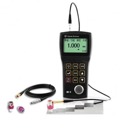 單晶延遲線探頭的手持式精密超聲波測(cè)厚儀UD-3,采用單晶延遲探頭,利用多次回波提高精度,使分辨率可達(dá)0.001mm,測(cè)量下限達(dá)0.30mm 。UD-3具有普通和精密兩種工作模式。普通模式采用界面波-回波法,測(cè)量范圍是 1.5mm~20mm ;精密模式采用回波-回波法,測(cè)量范圍是 0.30mm~10mm。